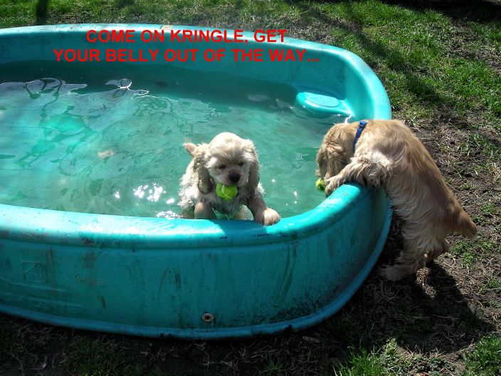 How are you this week? We are great! The weather has been really warm and we like to play in our swimming pool! We spend a lot of time outside playing in our yard. Know what? Nicholas can jump over the fence now and he got in trouble. One time he was trying to jump in mommy's flower bed, and he got stuck, I laughed my tail off at him, he looked really funny. Me ( Kringle ), can't jump over the fence if my life depended on it...My belly is bigger than Nicholas', he is always joshing me about it. Just get a load at a couple of those pictures mommy took, whew.